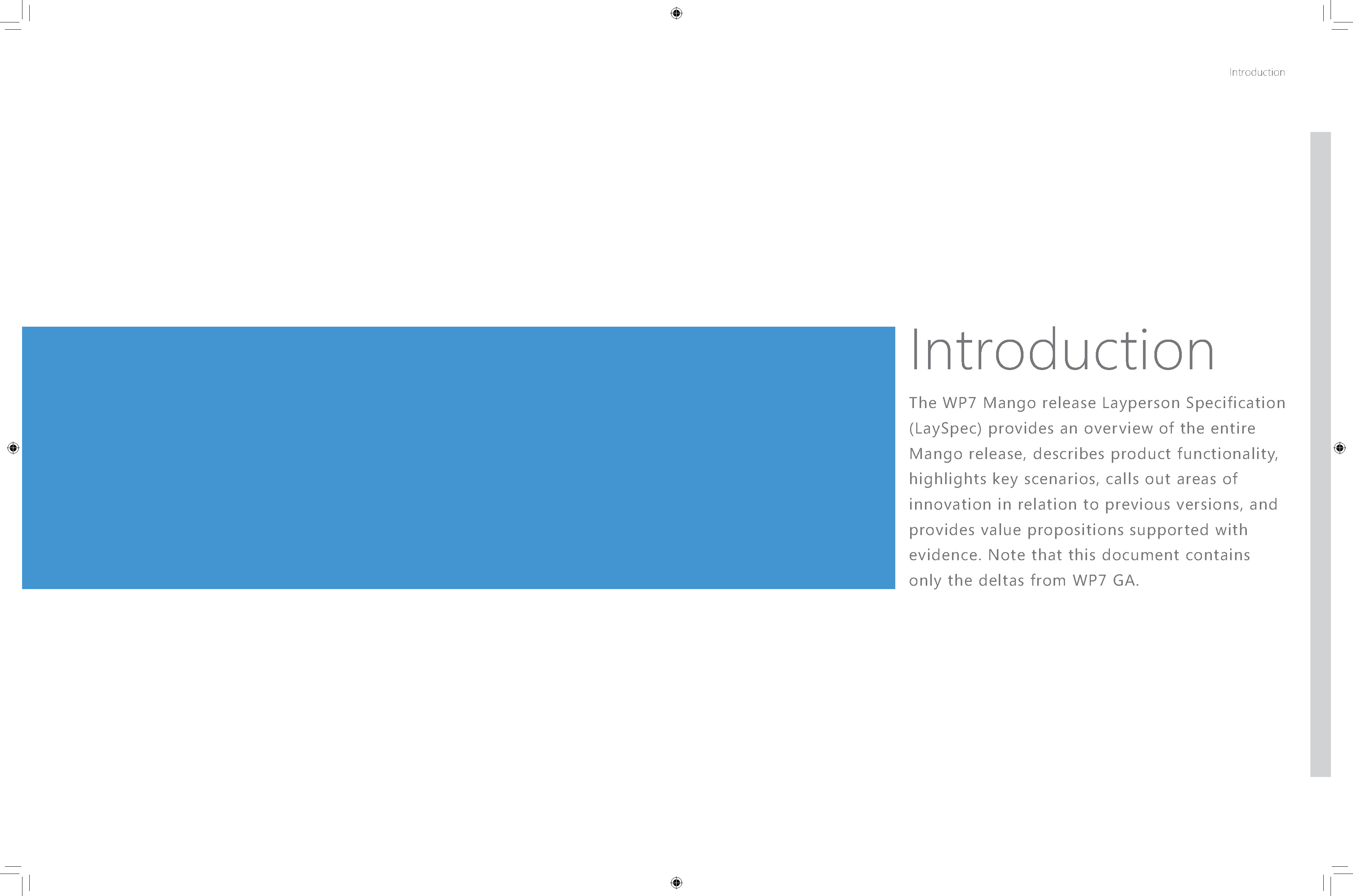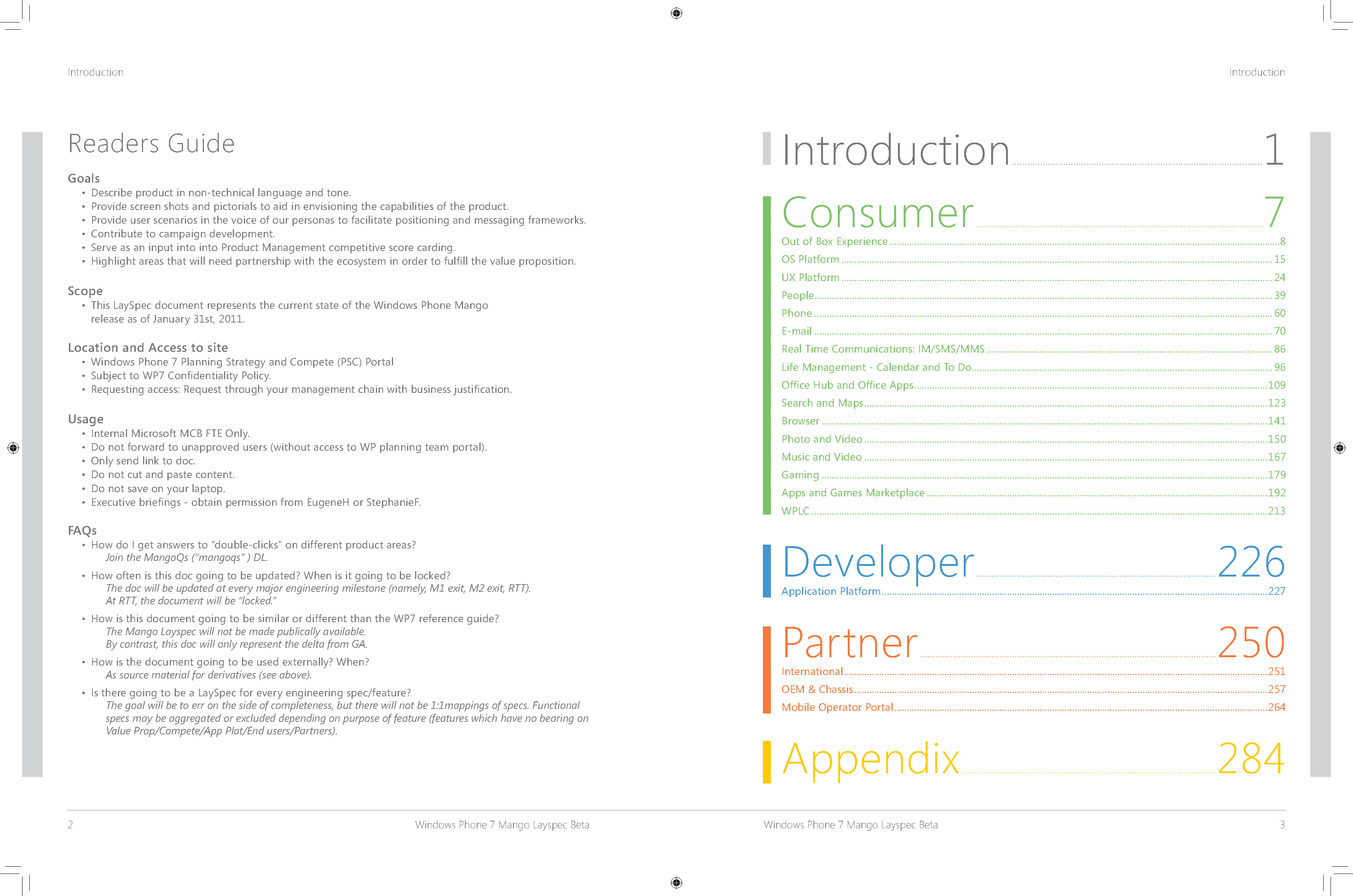A 284-page internal Microsoft platform specification document for Windows Phone 7 Mango, produced at CM Group with designer Chad Lundberg. Marked Microsoft Confidential and restricted to internal Microsoft FTE, the document defined the Mango release across Consumer (Out of Box Experience, OS Platform, UX Platform, People, Phone, E-mail, Real Time Communications, Life Management, Office Hub, Search and Maps, Browser, Photo and Video, Music and Video, Gaming, Apps and Games Marketplace), Developer (Application Platform), and Partner (International, OEM & Chassis, Mobile Operator Portal) sections.